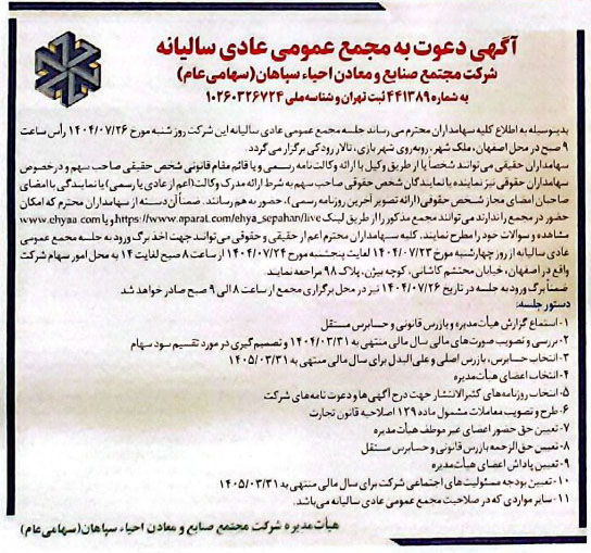 آگهي دعوت به مجمع عمومی عادی سالیانه شركت مجتمع صنايع و معادن احياء سپاهان ( سهامي عام )